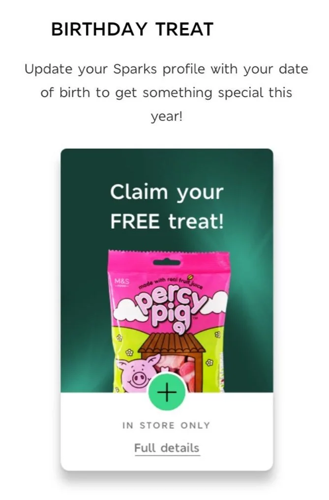 Enjoy a free birthday treat when you join M&S Sparks and add your date of birth. When your birthday comes around you’ll get a free treat including Percy Pigs or Colin the Caterpillars!