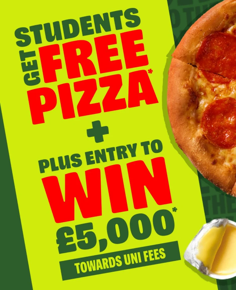 Students get a free personal pizza when they sign up to Papa Johns before 31st October.