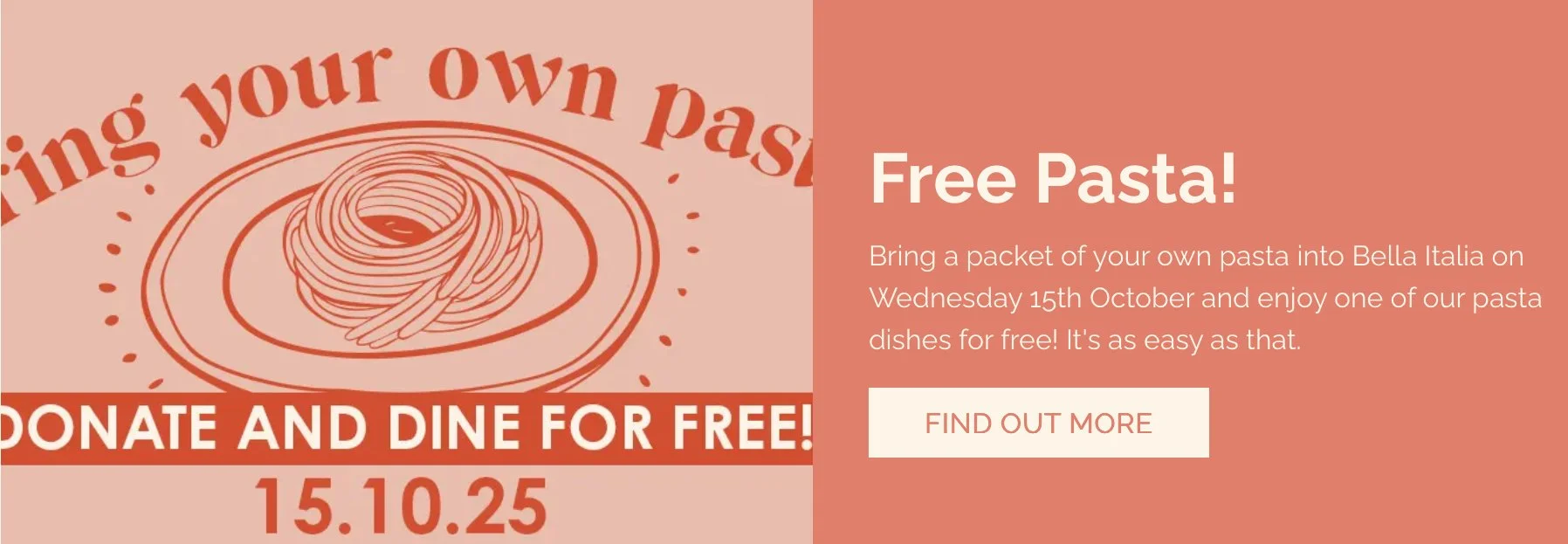 On Wednesday 15th of October, bring an unopened pack of dried pasta to your local Bella Italia and they will swap it for a free main pasta dish. You can bring any single unopened packet of dry pasta and can choose from any classic pasta dish from the menu. This offer is limited to one free pasta dish per person with the donation of one packet each.