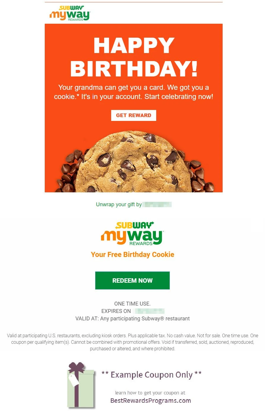 When you join Subway Rewards you’ll receive a free birthday reward of a cookie, crisps or more!